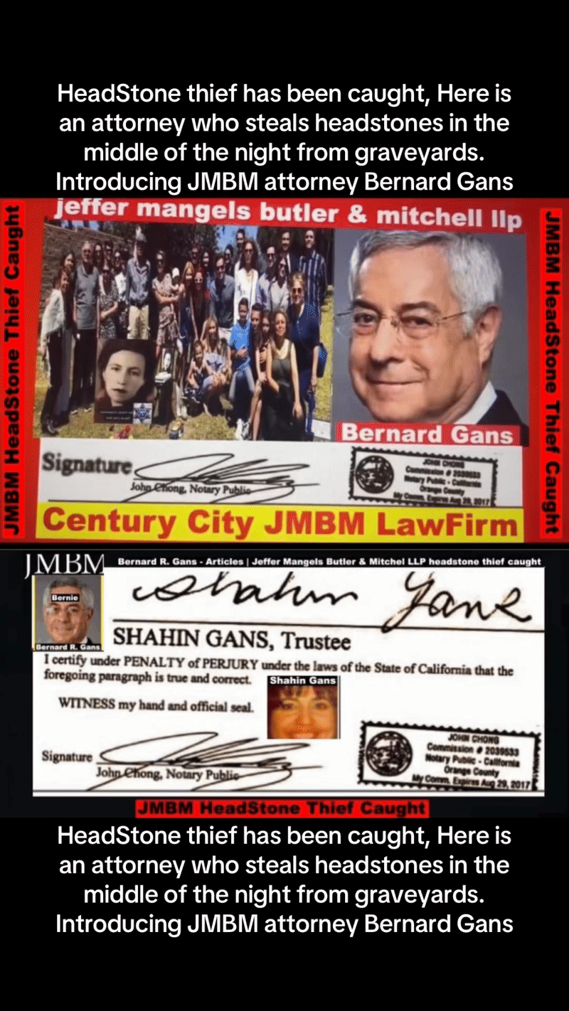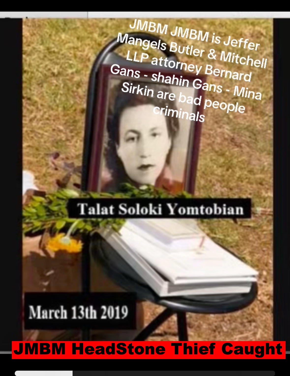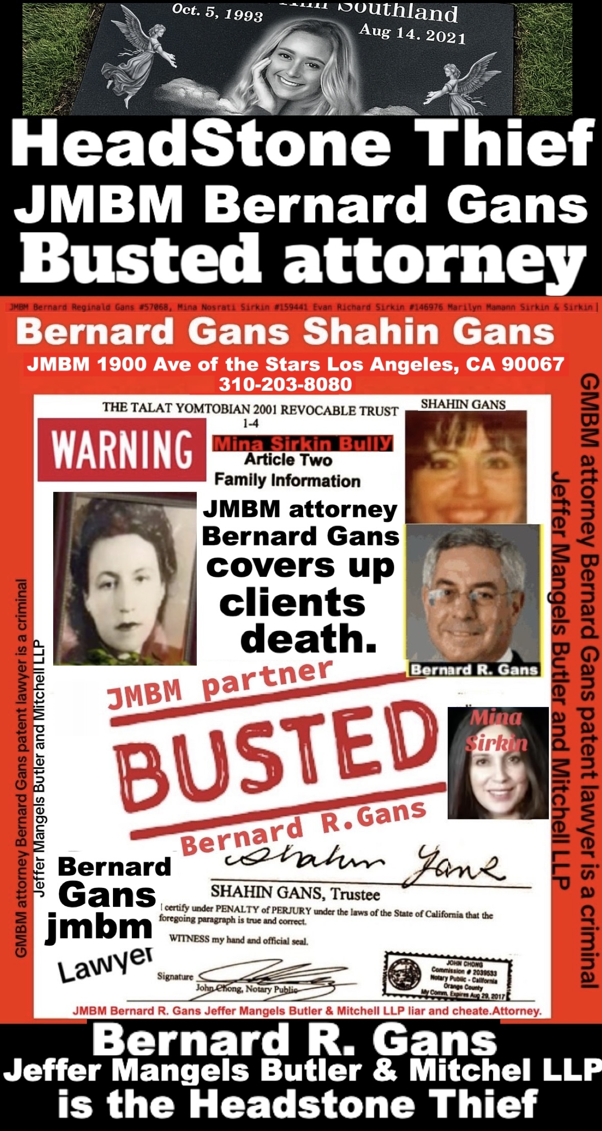 Century City Police 90067 Department JMBM attorney Thief Bernard R. Gans Jeffer Mangels Butler & Mitchel LLP JMBM attorney thief you have 24 hours to place the headstone or we are going to Century City Police department to report your crimes.